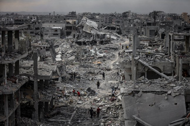 Displaced Palestinians,including children,returning to their destroyed homes after the ceasefire agreement (Picture: Getty)