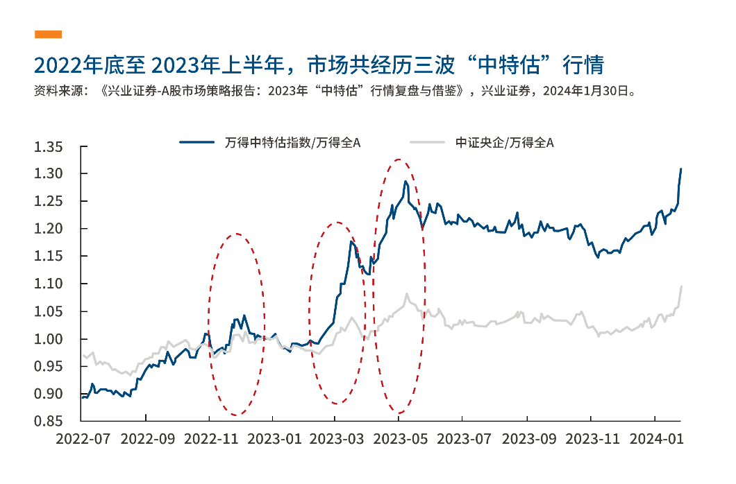 從2022年11月「中國特色估值體系」這一概念被提出後,到2023年上半年,中特估成為市場的主線方向之一,幷分別在 2022 年 11 月下旬、2023年2月中旬至3月中旬、2023年4月初至5月中旬期間,三次領漲市場,表現十分亮眼。但這三次上漲行情又有所不同,此前兩次更多聚焦在建築、石油、煤炭、鋼鐵等傳統「中字頭」行業,第三次則由於數字經濟行情的催化,運營商、出版、算力等TMT方向國央企也顯著上漲,中特估概念涉及的範圍出現了擴大。(來源:市場公開資料,下同)