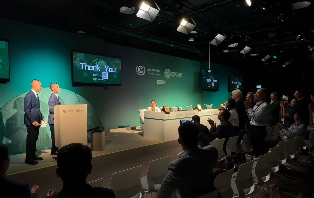 Arthur Li Pingsen and Carter Li Pinghang mentioned in their speech that they received 89 valid questionnaires for this survey. They analyzed the students' answers and based on their analysis, presented a speech at the COP28 conference. The survey results showed that 25% of students were not aware of the impact of climate change, but nearly 90% of students knew the relationship between carbon dioxide emissions and climate change. Arthur Li Pingsen and Carter Li Pinghang said that they will continue to track the latest developments on climate change based on the results of this questionnaire and share with their peers. They also plan to invite experts to give lectures at the school to encourage more peers to join the efforts to cope with climate change. The audiences stood to applauded the two teenagers right after the speech.