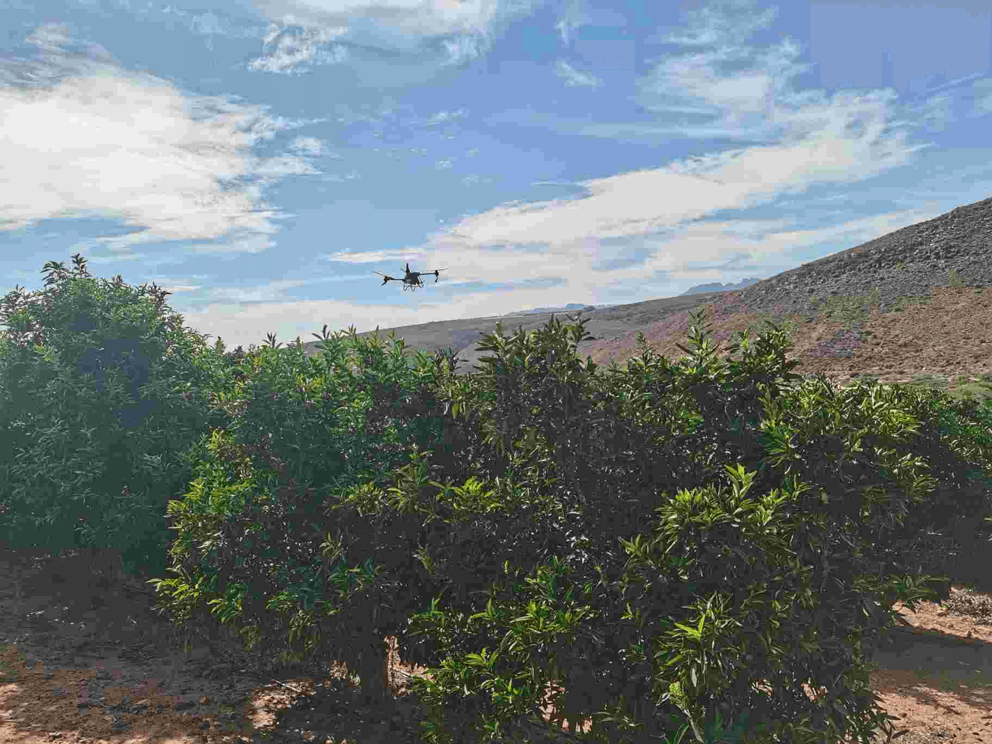 DJI Agras drones spraying over sloped terrain