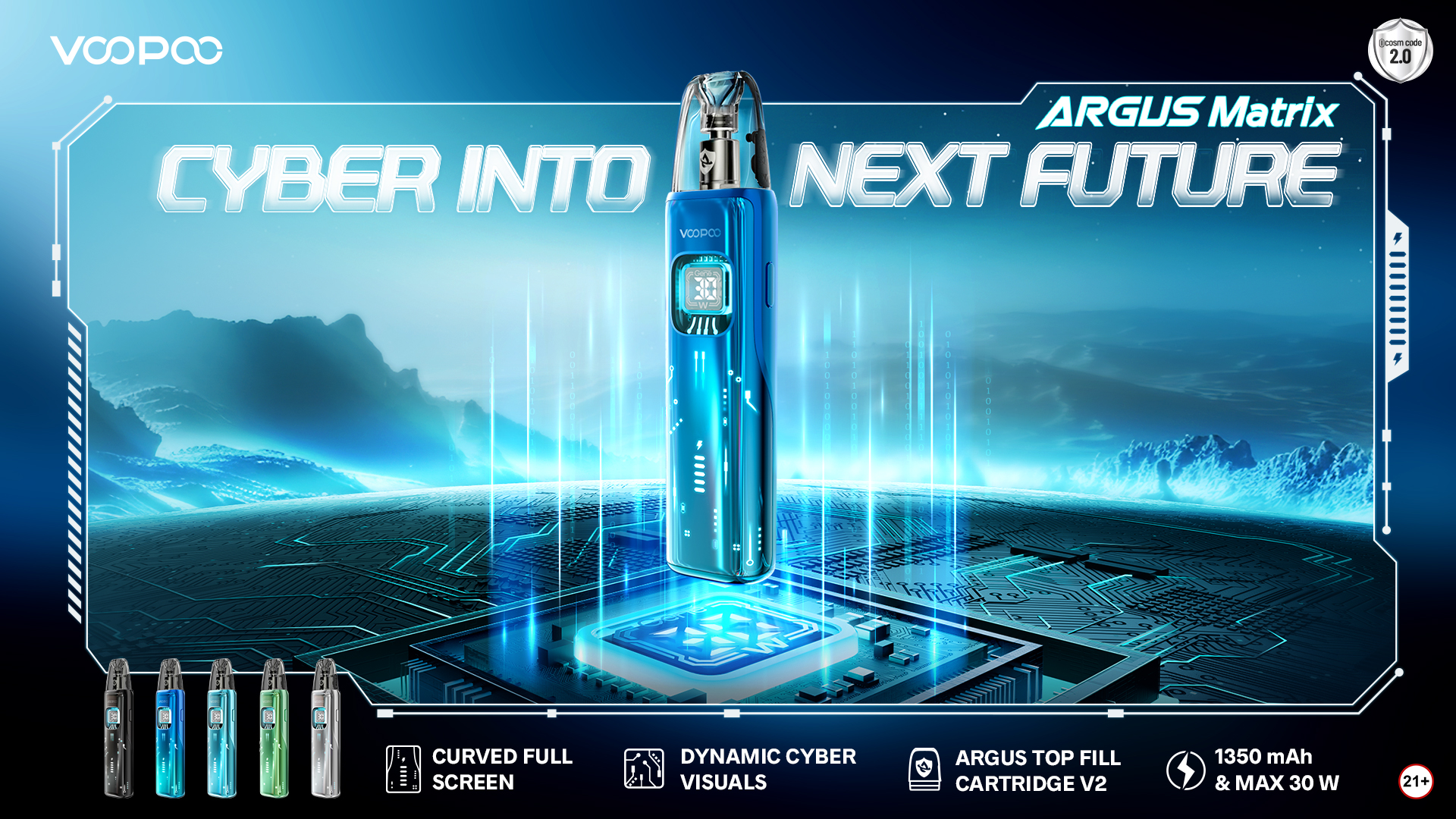 The future of vaping has a new shape: VOOPOO, the industry-leading brand, redefines innovation with the ARGUS Matrix - the first POD to feature a curved full screen and dynamic cyber-futuristic visuals that revolutionize vaping. With its sleek, cyber-aesthetic design, the ARGUS Matrix offers a truly futuristic vaping experience, combining style and substance like never before.
