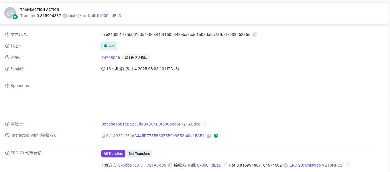 Liquidity concentration is another big red flag. AS (AKAS token) on Polygon (0x6a92…b26e) mainly trades in a single AS/DAI pool on QuickSwap. On-chain data is clear: one heavily concentrated pool holds nearly all short-term volume, TVL, and FDV. This may look “stable” in fair weather, but it’s really stability on thin ice. A key wallet (0x5dba…ACd06) interacts heavily with this pool, regularly executing large DAI→AS swaps (visible via QuickSwap v3 routing). In other words, the market’s lifeline sits in very few hands.