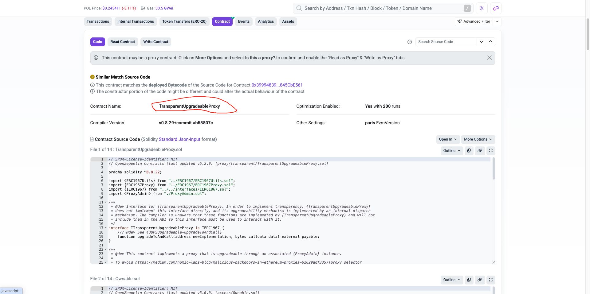 More concerning: key permissions are not gone. The treasury/mint proxy at 0xD7C9…c80a8 uses OpenZeppelin’s transparent proxy pattern, and ProxyAdmin at 0x880913…d80aF openly lists transferOwnership, renounceOwnership, upgradeAndCall. This means someone still holds the switch. There’s also 0x5f575c…8926, tagged as a new deployer/operator, with an unverified contract (0xB228B9…6327) making frequent calls in July–August — suggesting an operational handover, not renouncement.